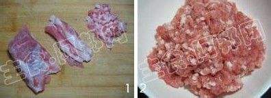 猪前腿肉洗净后依次切薄片、切细丝、切小丁,然后反复用力的剁成肉糜; 葱、姜洗净切末;