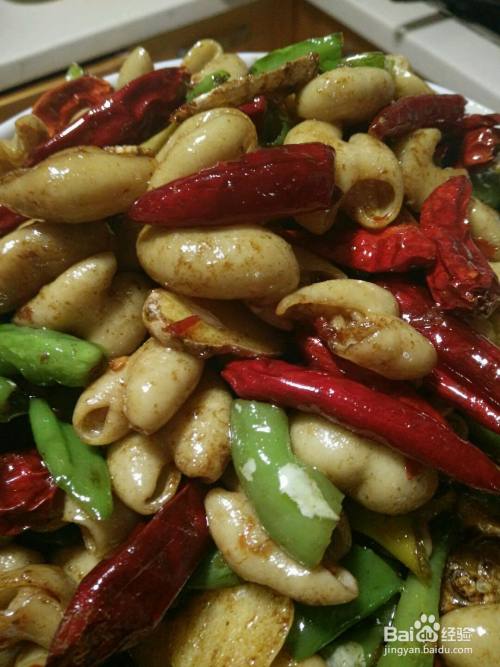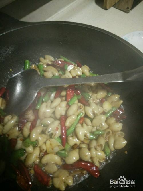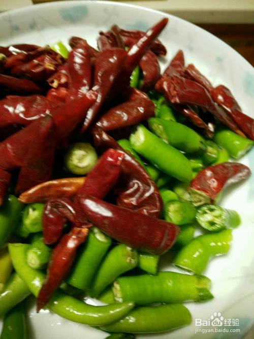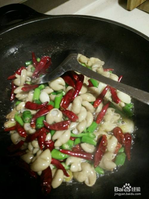油热以后下肥肠爆干,下青、红辣椒段,一起炒