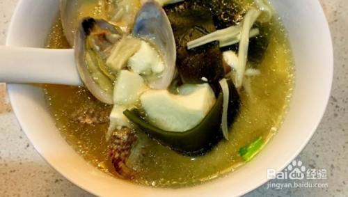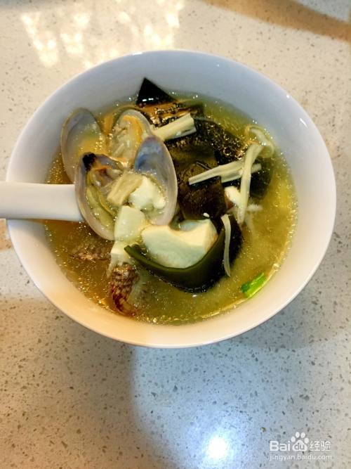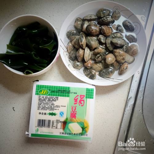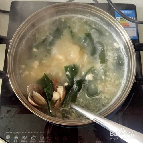 味增料化开之后,把蛤蜊,海带和豆腐一起放入锅中,等烧开。
