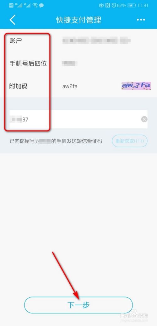 进入快捷支付管理界面,输入建行卡号、手机号后四位、附加码,点击下一步。