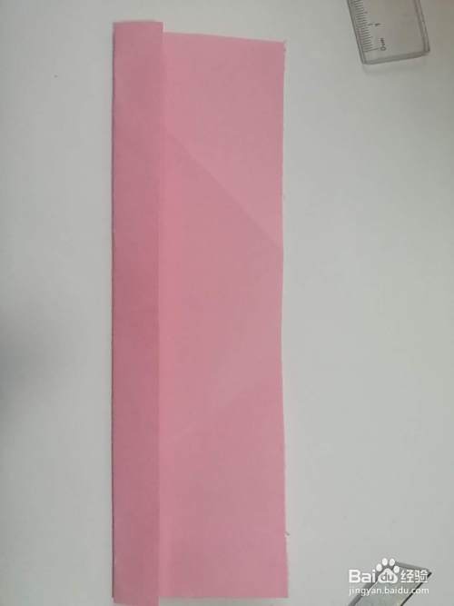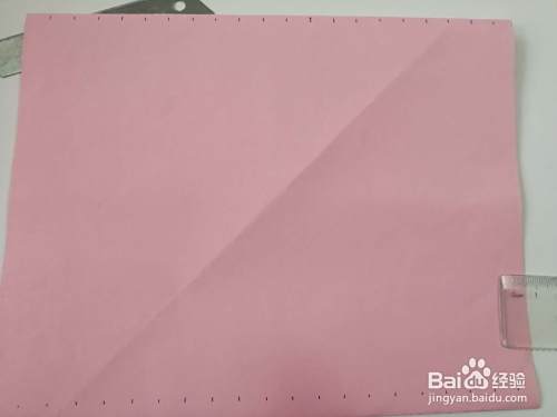 用直尺沿折叠好的彩纸长边,按照1厘米一个格的方式做标记,两侧都做好标记。