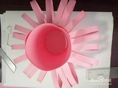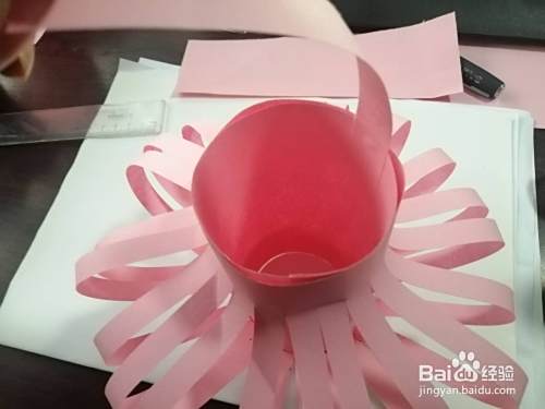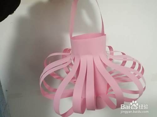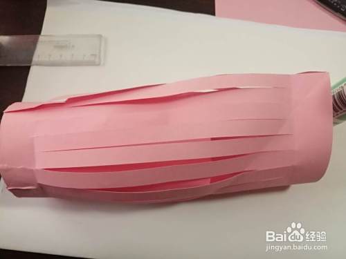 将1厘米彩条纸的端部和圆筒纸粘接,两端粘结牢固。这样一个小灯笼就做好了。