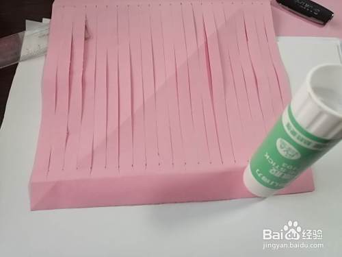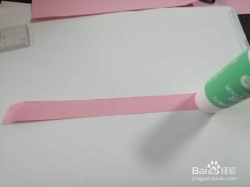 将第一张裁好的彩纸拿出,在折痕处涂满胶液。