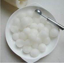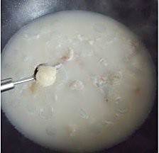 煮开后将萝卜球倒入,维持大火3分钟后改用中小火炖,炖到萝卜透明熟透后,将鱼肉泥用勺子挖入汤中煮熟