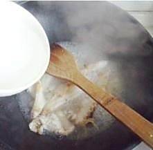 炒锅中倒入适量油,放入姜片,再放入鱼骨略煎,待煎至两面微黄时,加入盖过鱼骨3CM左右的开水