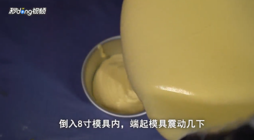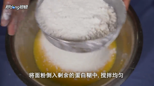 4之后将三分之一蛋白加入蛋糕糊中,将面粉倒入剩余的蛋糕糊中,搅拌均匀,倒入8寸磨具内,端起磨具震动几下