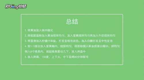 6总结如下,首先将黄油放入锅中融化,将低筋面粉放入黄油中搅拌均匀,加入蛋黄,牛奶搅拌均匀,然后将蛋清加入盐和柠檬汁,之后再加入白糖打发,之后去三分之一蛋白加入蛋糕糊中,,倒入8寸磨具内,端起磨具震动几下,最后,将蛋糕糊放入烤箱END