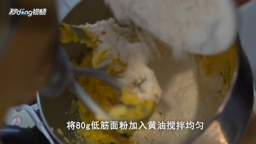 2首先将黄油放入锅中融化,将80g低筋面粉放入黄油中搅拌均匀,加入30g蛋黄搅拌均匀后再加入80ml牛奶搅拌均匀