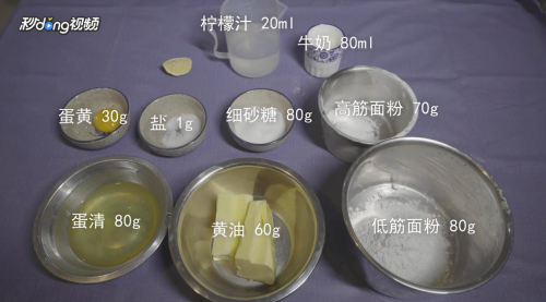 1准备材料,柠檬汁20ml,牛奶80ml,蛋黄30g,盐1g,细砂糖80g,高筋面粉70g,低筋面粉80g,蛋清80g,黄油60g