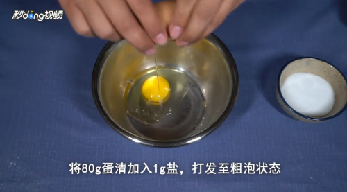 3然后将80g蛋清加入1g盐和20ml柠檬汁,打发至粗泡状态,之后再加入80g白糖打发至中性状态
