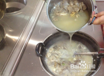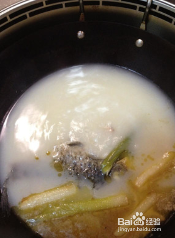 羊肉汤炖了5,6个小时以后再把鲫鱼汤一起倒进去熬。