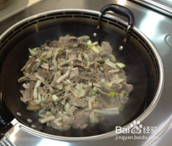 然后就下羊肉和羊杂继续大火炒,加入适量的盐,胡椒。