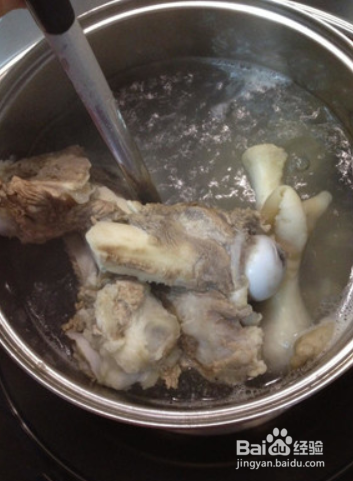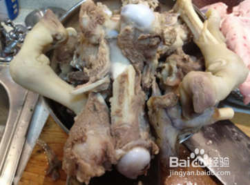 将猪棒子骨和羊蹄、羊肉一起焯水,然后加入生姜,葱结,陈皮,八角,花椒和适量香料大火烧开,撇去浮沫,最后加入料酒,少量胡椒。