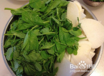 准备吃羊肉汤的材料了,先剁小米辣,青椒,香菜,葱,然后将白萝卜切片,豌豆尖只要尖尖,切上两个白锅盔。