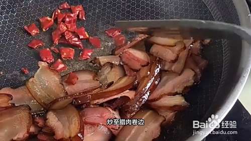 将腊肉放入锅中,炒至腊肉卷边,放入干辣椒炒香。