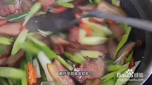 倒入辅料炒香,加入蒜苗,翻炒至蒜苗发软即可。
