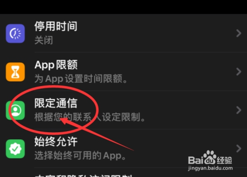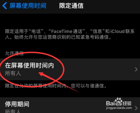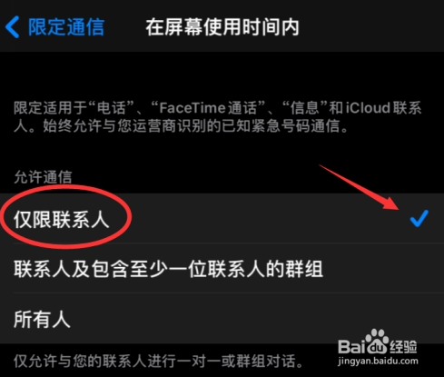 点击“在屏幕使用时间内”选项,勾选仅限联系人。