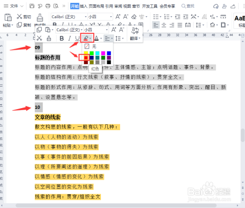 接下来,我们把09和10的序号选中,在漂浮的选项中把【突出显示】设置为红色。