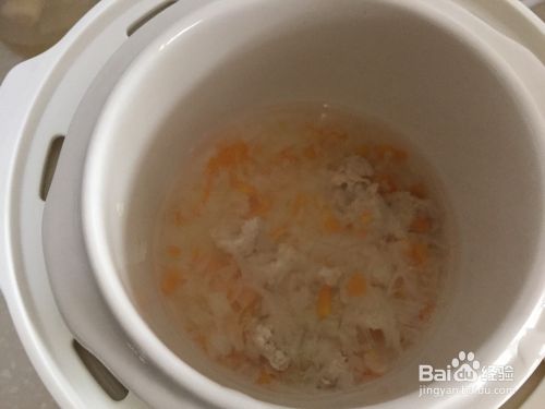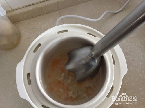 等到胡萝卜软烂后,如果是新鲜剁碎的鸡肉,可直接过滤下;如果像我这个是冷冻的,可以拿搅拌棒直接搅拌下即可。当然大一点的宝宝也可以直接吃。