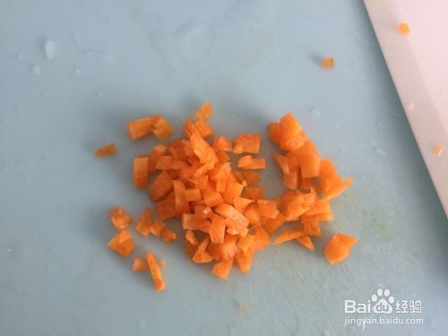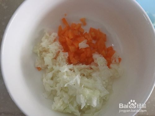 胡萝卜去皮切丁。白菜洗净切碎。两者放入碗中待用。