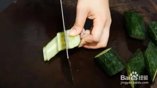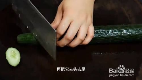 再把它去头去尾,用刀把黄瓜斜着切成小菌婶段。