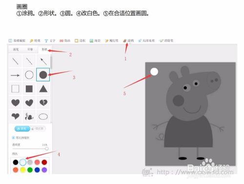 ①涂鸦。②形状。③圆。④改白色。⑤在合适位置画圆。
