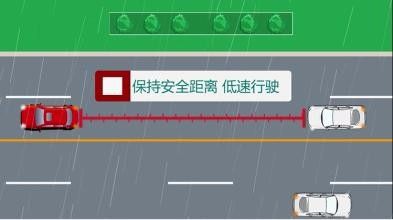 二、减速慢行,下雨天,路上有积水,刹车时容易打滑,所以一定要降低车速,不要急踩刹车,减速时,还是要以油门控速为主呀。