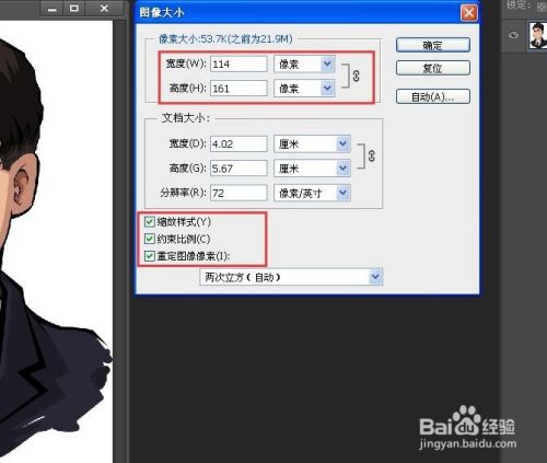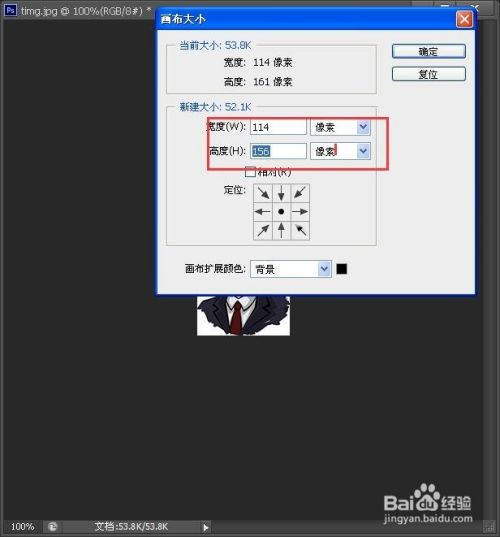 宽度改成114,这里高度会自动变成161,注意后面单位是“像素”,因为下面“约束比例”,所以照片宽度变的同时,高度也会根据比例自动变化。