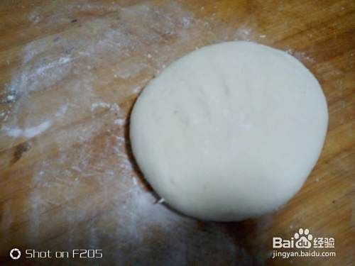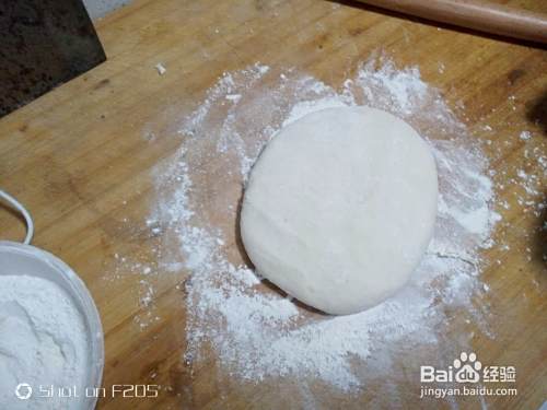 揉好之后,撒点面粉,在面团的下边,然后用手将面团按压几下,使它变扁