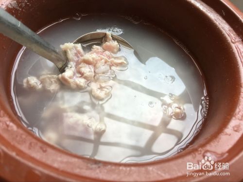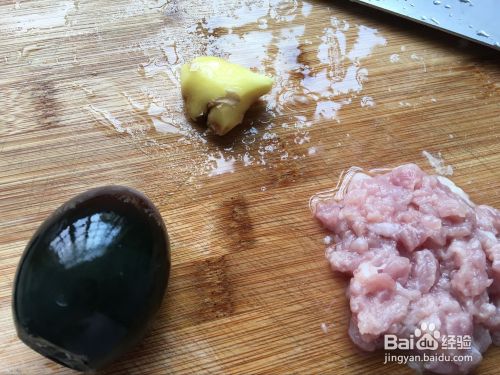 然后加入瘦肉,皮蛋(已经切好),最后再放入姜丝。