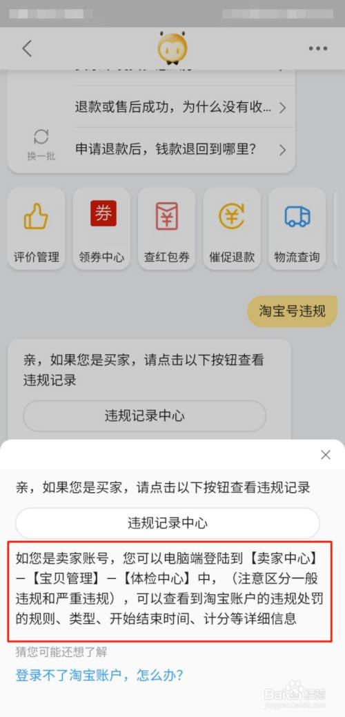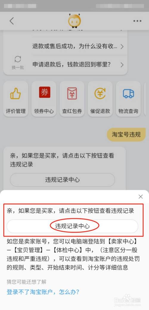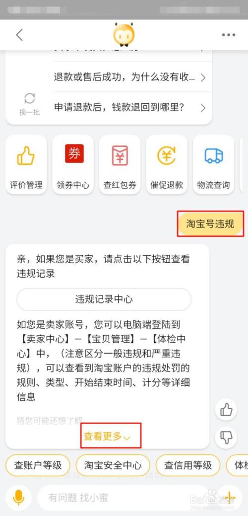 在对话框中输入“淘宝号违规”,在回复的信息中选择“查看更多”。
