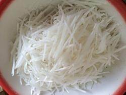 将白萝卜擦丝后装入盘子中备用。
