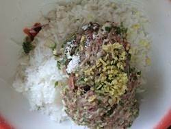 将五花肉、白萝卜丝剁碎(不用太碎)放入容器中,加入适量面粉、食盐、葱姜末、豆腐等,再将2枚鸡蛋蛋清倒入其中(将馅、佐料综合起来,更加酥嫩可口),搅拌均匀。