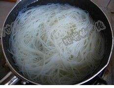 煮米线的同时放上配菜一起煮,煮熟后连汤一起倒入大腕中。