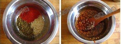 把红椒粉,青花椒和白芝麻放入一个小碗里,锅里烧一点油,冒烟后关火,稍晾几秒钟倒入小碗。