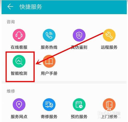 在打开的“快捷服务”页面,找到“咨询”栏目中的“智能检测”选项,点击进入,如下图所示: