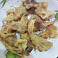 9. 将裹上蛋糊的蘑菇放油锅里边小火炸至蘑菇变脆即可捞出
