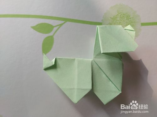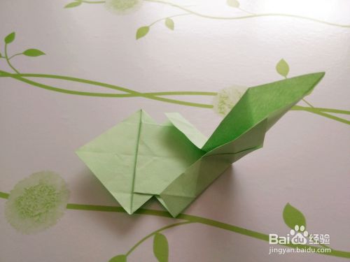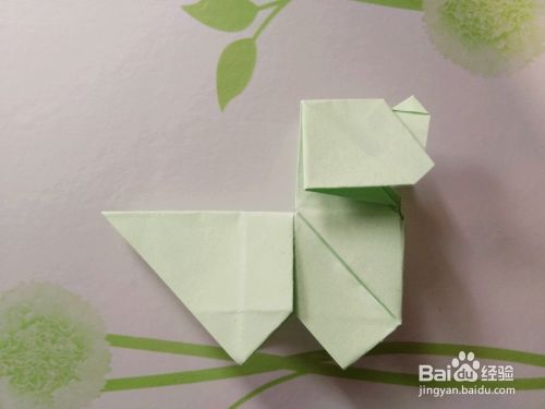 将尾端的角向下垂直折叠,再向上折叠,并展开,沿折痕向上翻折,小狗尾巴就折好了。画上眼睛和鼻子,完成。