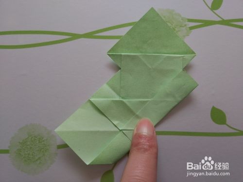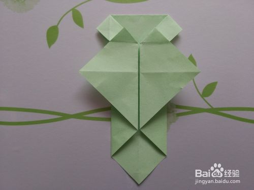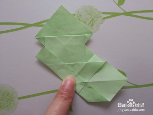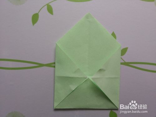 将上边左右两边的三角形,撑开,按图所示折叠。将中间左右两边的图形,里面的角翻出来,沿着折痕折叠。
