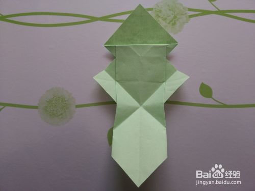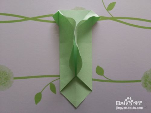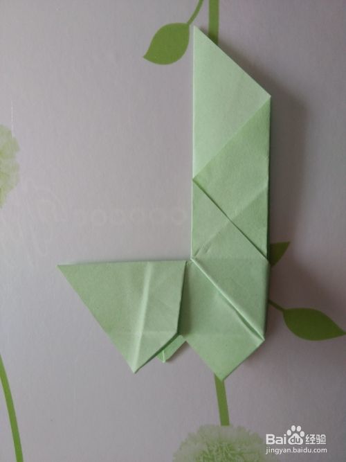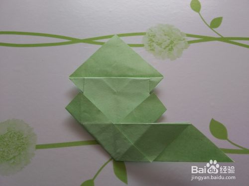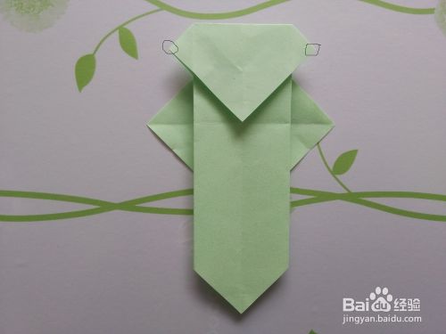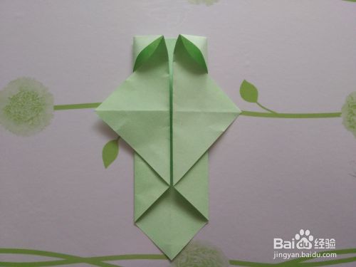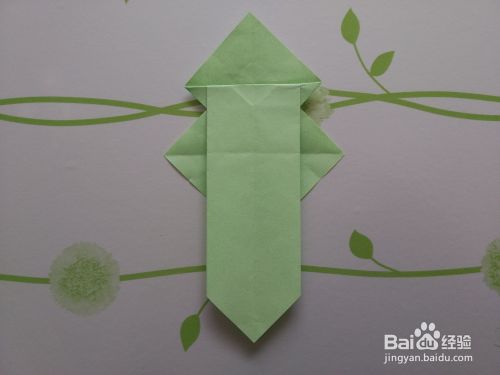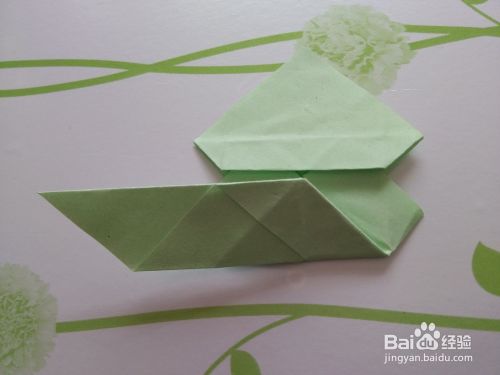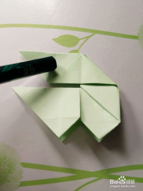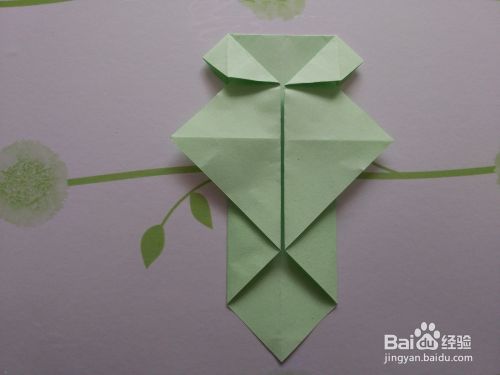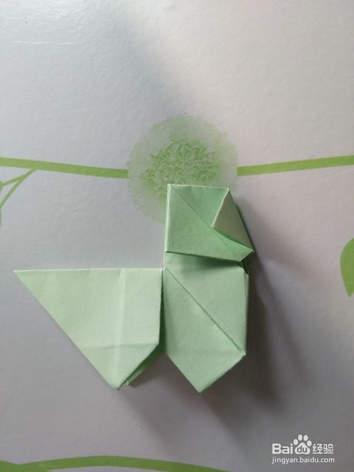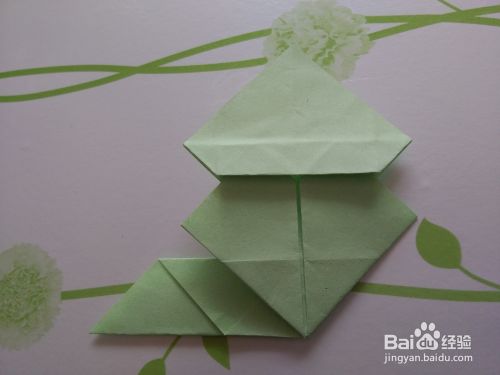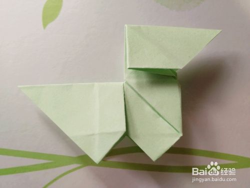 将前端的角向后下方折叠,再向上折叠,并展开,沿折痕向上翻折;再将上面的小角,向上翻折,小狗头就折好了。