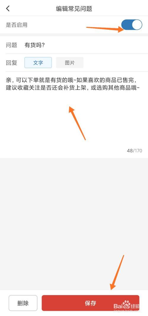 点击【启用】,并设置问题及回复内容,点击【保存】。