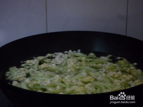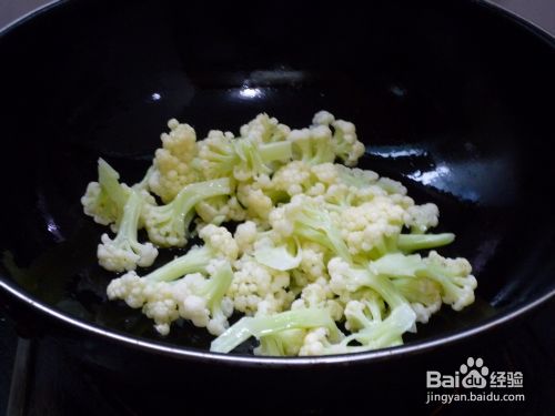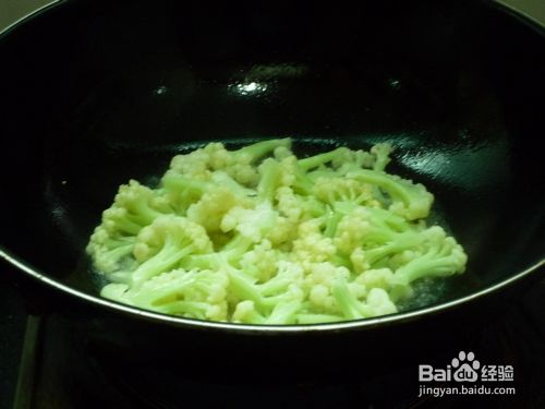 花菜放入锅里,翻炒半分钟。