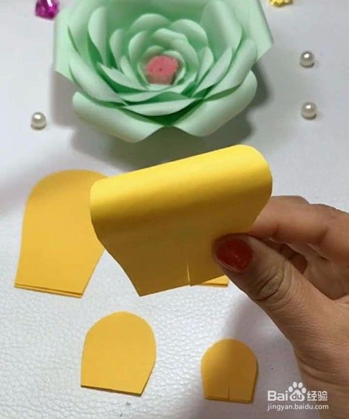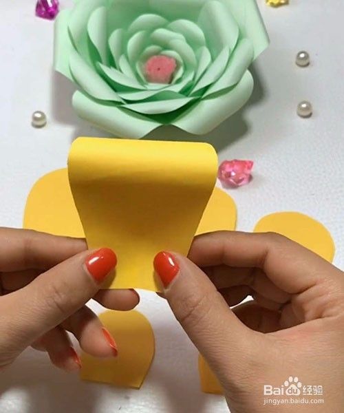 再从小的花瓣粘起,如图一样把花瓣一片一片的粘到一起成圆形,以次把另外4个花瓣做好。