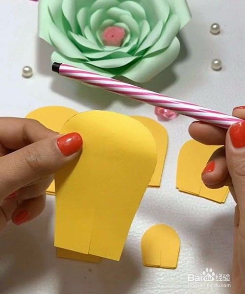 再拿起一片花瓣和笔筒,如图一样把花瓣卷到笔筒上,然后再取下笔筒。