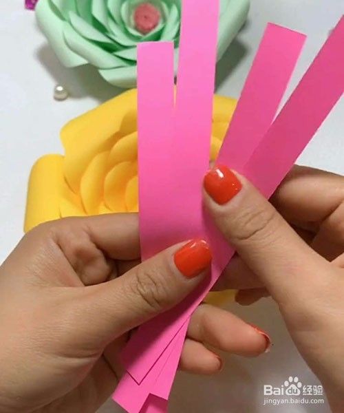 再把另外的彩纸剪成4个长条,再叠在一起如图一样剪好。