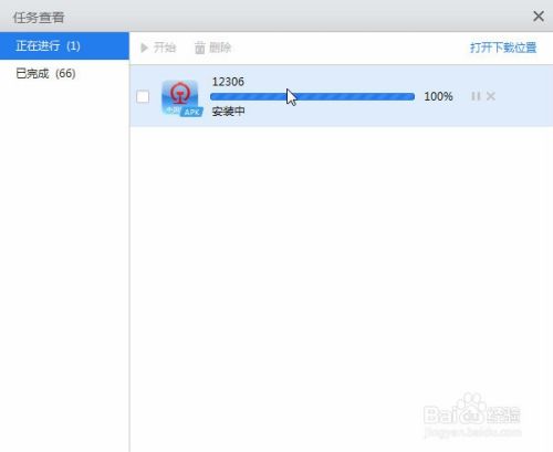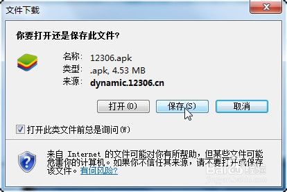 或者点击取消,默认会弹出apk下载窗口,如图。如果你的电脑的apk不是和虚拟机关联的,那么点击打开后也会在下载完成自动安装;但是要是和虚拟机关联的话(图示情况下apk软件默认是和蓝手指Bluestacks关联的),那就得先保存(否则这个经验就应该叫铁路12306电脑版该怎么下载安装了),然后用你的安卓手机助手软件,打开下载下来的apk软件包,然后就可以进行安装了