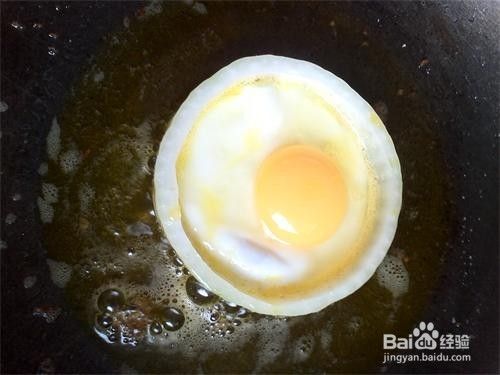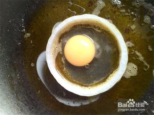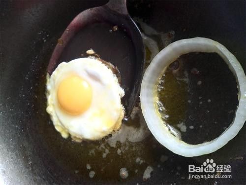 这时拿掉洋葱圈,用锅铲小心把鸡蛋翻过来。