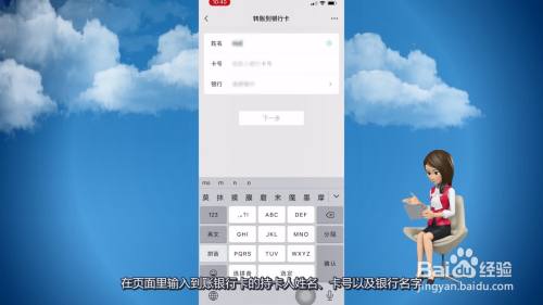 在页面里输入到账银行卡的持卡人姓名、卡号以及银行名字,点击下一步即可转账。