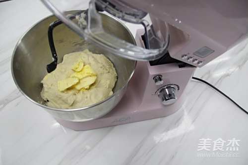 3加入盐和黄油,继续揉到光滑,可以拉出薄膜即可