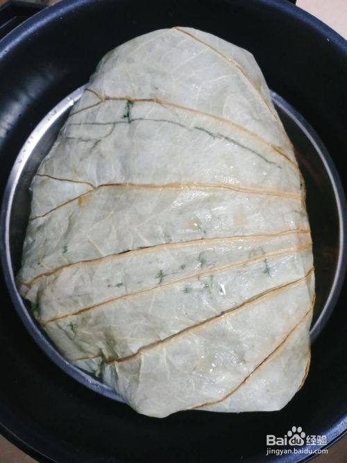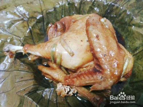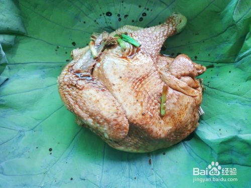 泡好的荷叶摊开,放上腌制好的鸡和适量的调料汁,刷一层花生油在鸡皮上。